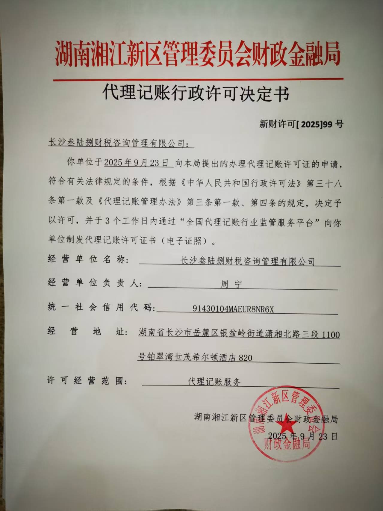 关于长沙叁陆捌财税咨询管理有限公司会计代理记账机构行政许可决定书