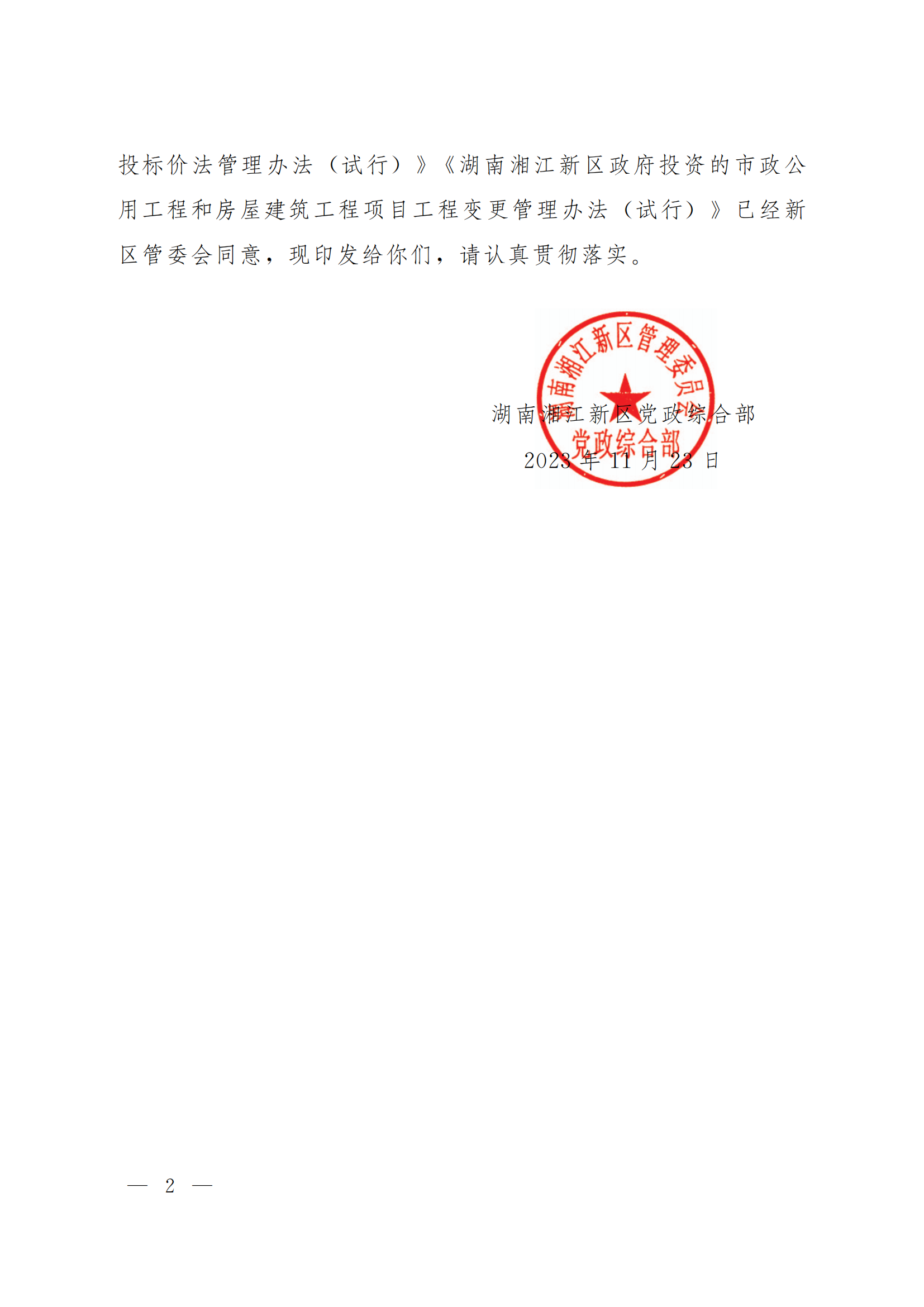 湖南湘江新区党政综合部关于印发《湖南湘江新区和记AG投资建设项目设计优化管理办法(试行)》《湖南湘江新区和记AG投资建设项目招标投标经评审的最低投标价法管理办法(试行)》《湖南湘江新区和记AG投资市政公用工程和房屋建筑工程项目工程变更管理办法(试行)》的通知