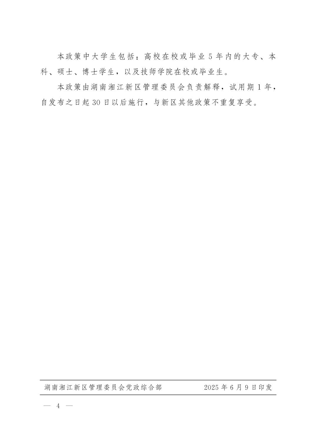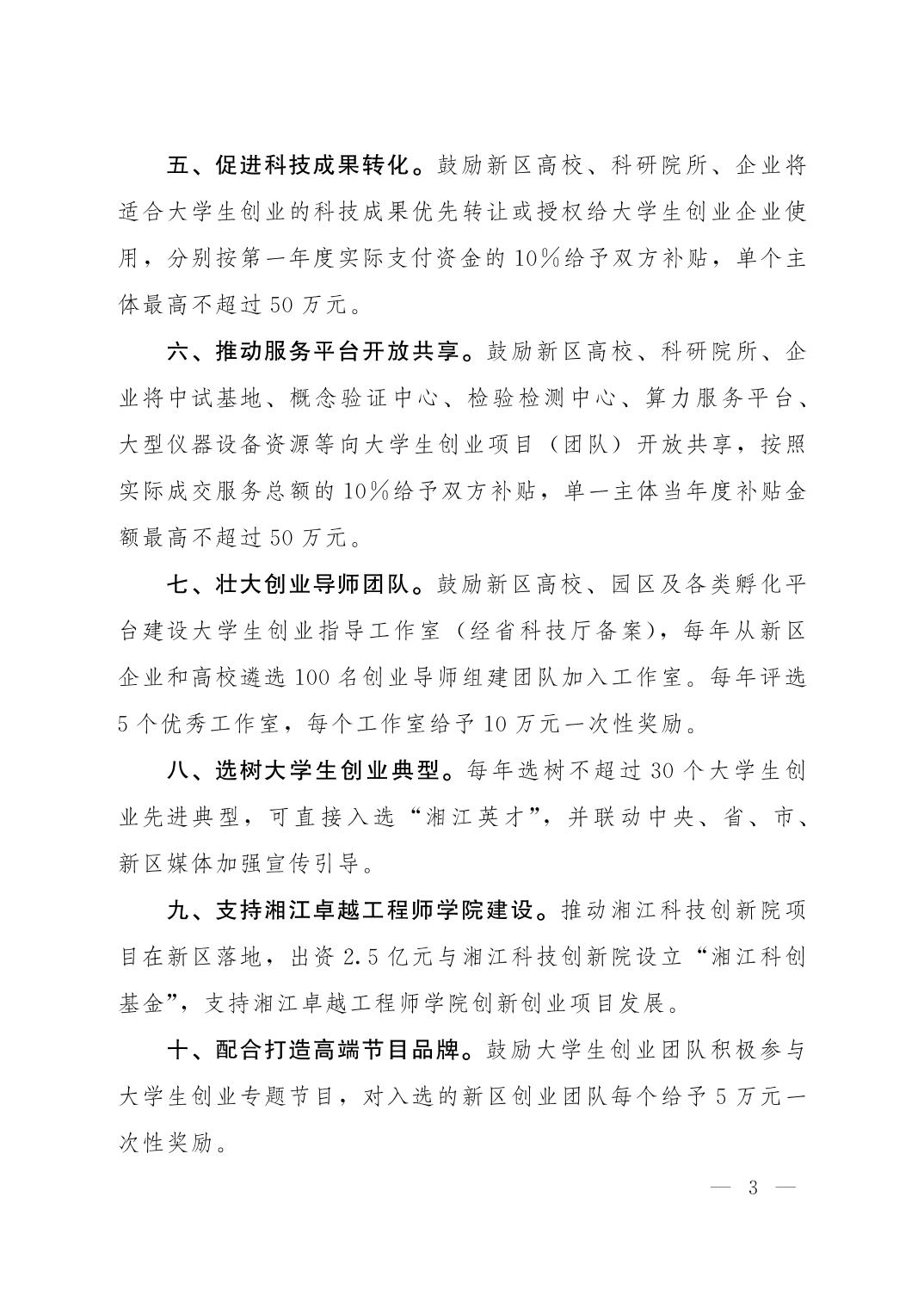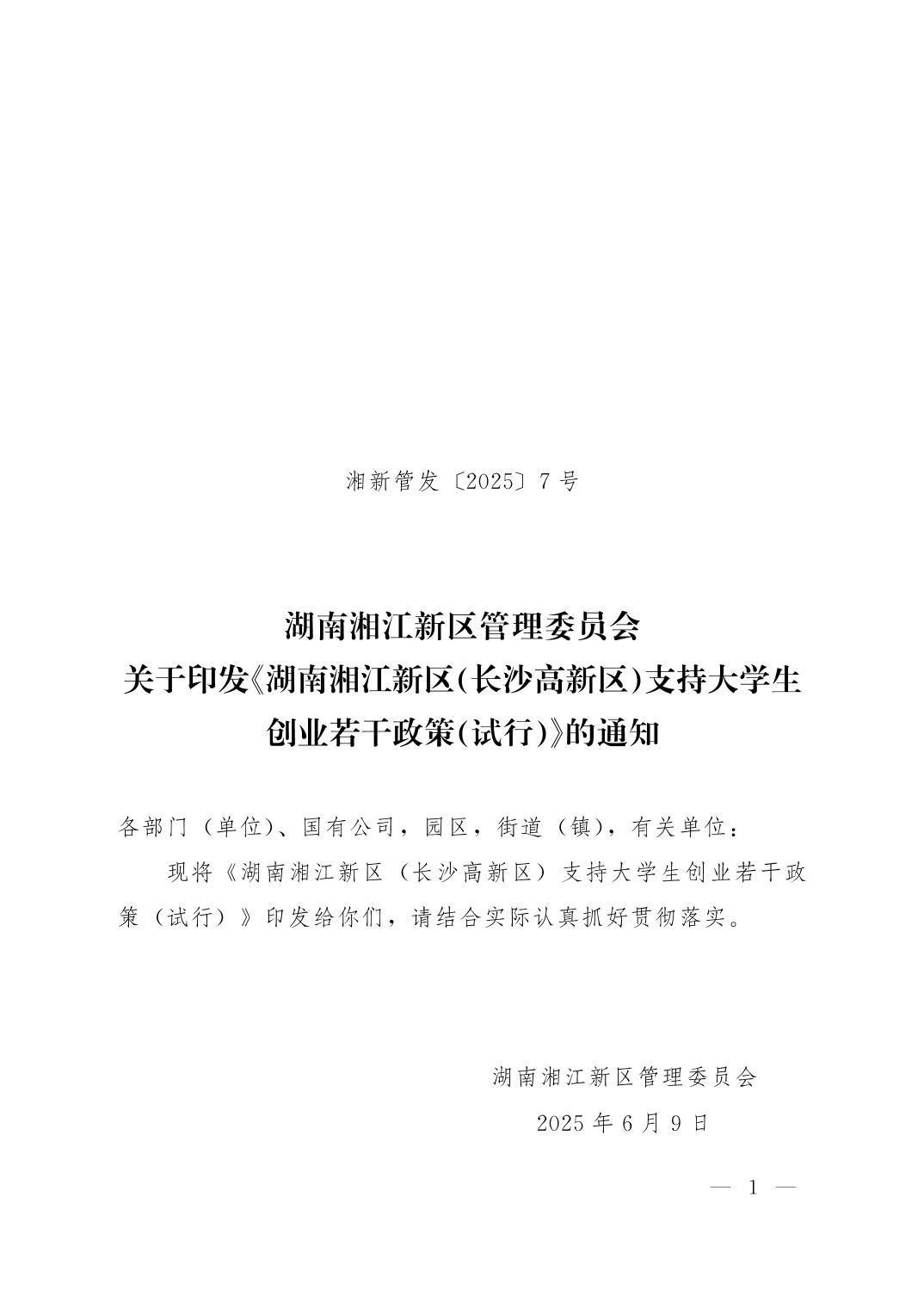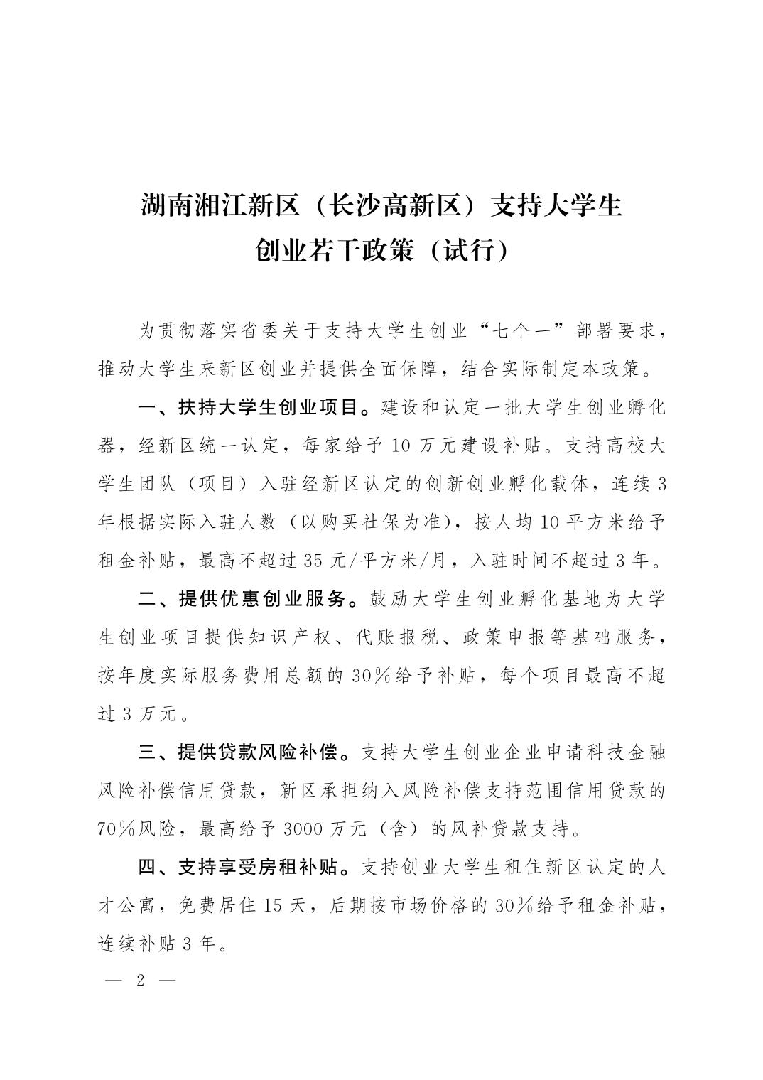 湖南湘江新区管理委员会关于印发《湖南湘江新区(长沙高新区)支持大学生创业若干政策(试行)》的通知