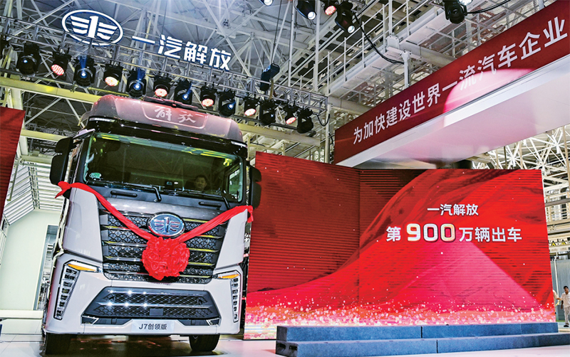 新中国成立以来,我国用几十年走完发达国家几百年的工业化历程,建成了门类齐全、独立完整的现代工业体系,成为驱动全球制造业发展的重要引擎。图为2024年7月16日,在吉林省长春市,中国一汽第6000万辆汽车暨第900万辆解放牌卡车驶下生产线。 新华社记者 颜麟蕴/摄
