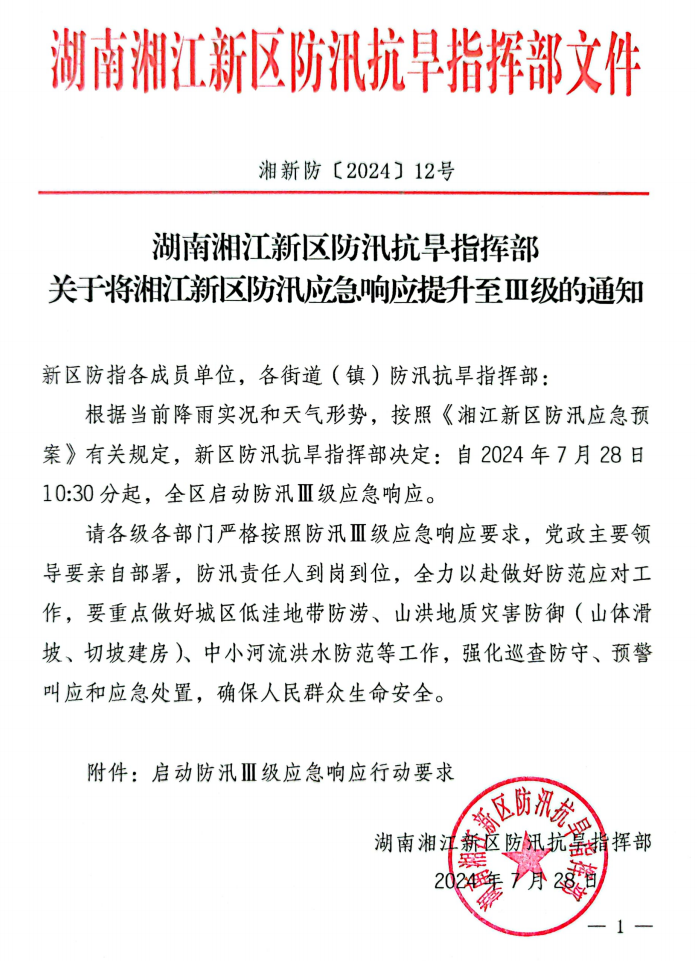 《湖南湘江新区防汛抗旱指挥部关于将湘江新区防汛应急响应提升至Ⅲ级的通知》