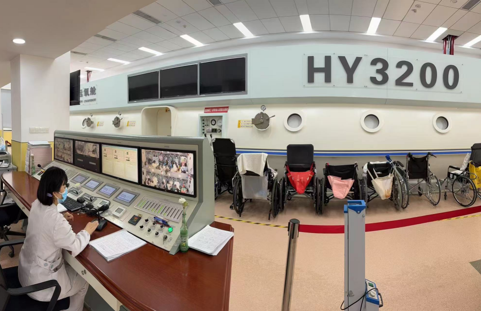 ↑高压氧治疗中心为患者进行高压氧治疗。